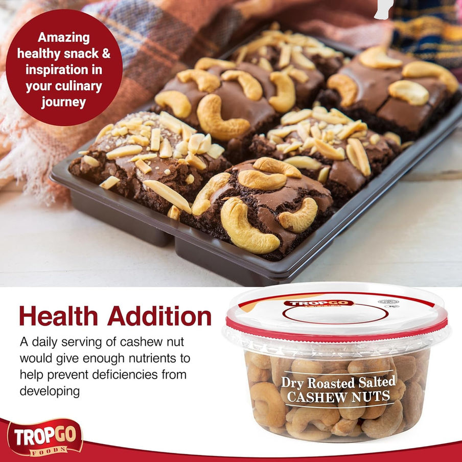 - Healthy Tub of Salted Cashews: Indulge to the savoury snack experience with Tropgo's Roasted Salted Whole Cashews. Made with freshly dried and roasted cashew nuts, our roasted cashew snack is your great choice for a nutritious and delicious protein snack.